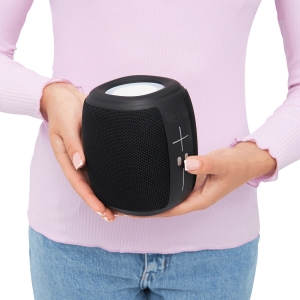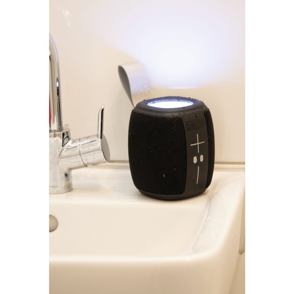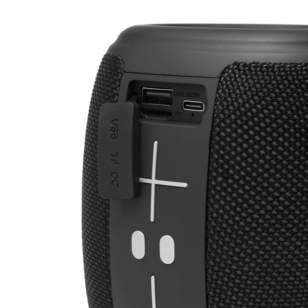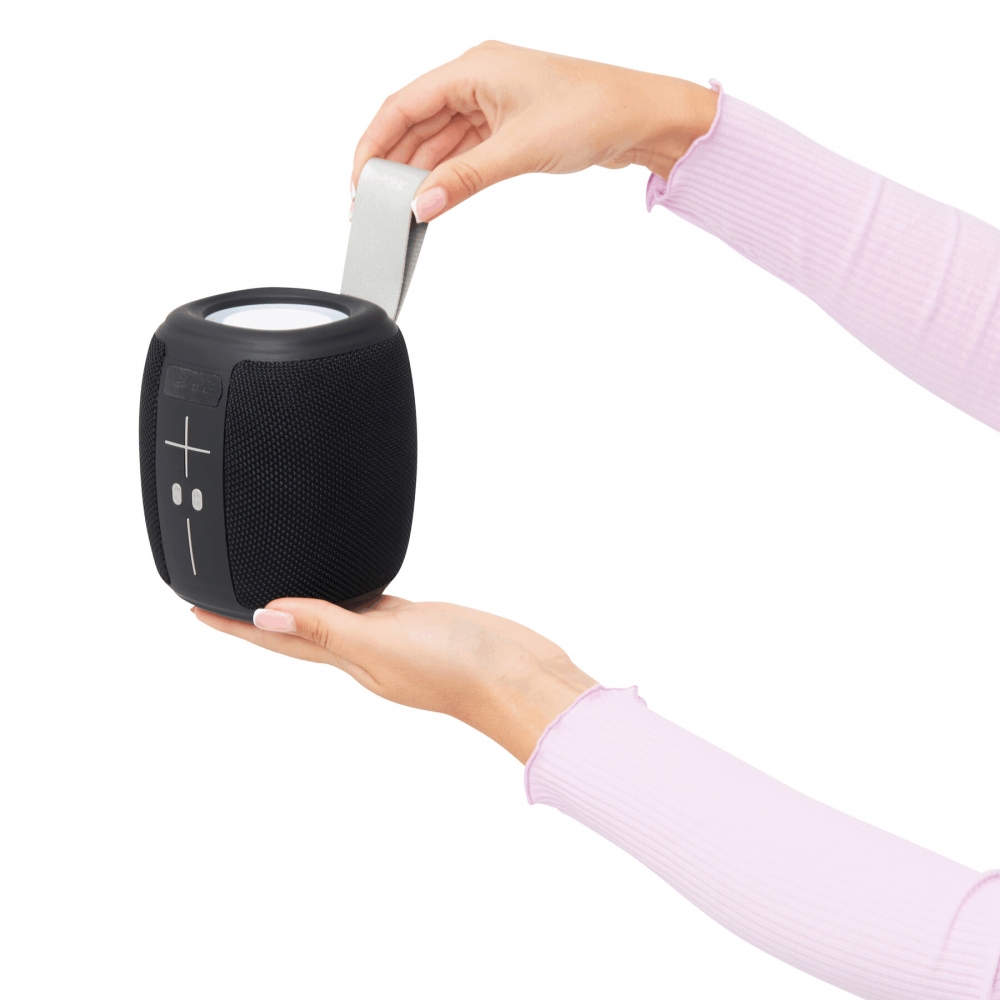 Artikel-Nr: INP58-8106013Wireless-Lautsprecher RESISTANT: Musikleistung 1 x 10 Watt, zur Kopplung mit wireless-fähigen Geräten, kompatibel zu Bluetooth®, Reichweite ca. 10 m, microSD-Slot und USB Typ A-Anschluss für MP3-Funktion, Freisprechfunktion, leistungsstarker Lithium-Akku, Kapazität: 1.200 mAh, inkl. USB-Ladekabel mit USB Typ C Stecker (Länge: ca. 50 cm), spritzwassergeschützt nach IPX4, mit farbwechselndem Licht oben, grauer Trageschlaufe, Bedientasten sowie An- und Ausschalter auf der Vorderseite und rutschhemmenden Standfüßen, in Box