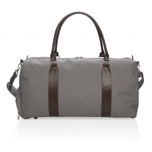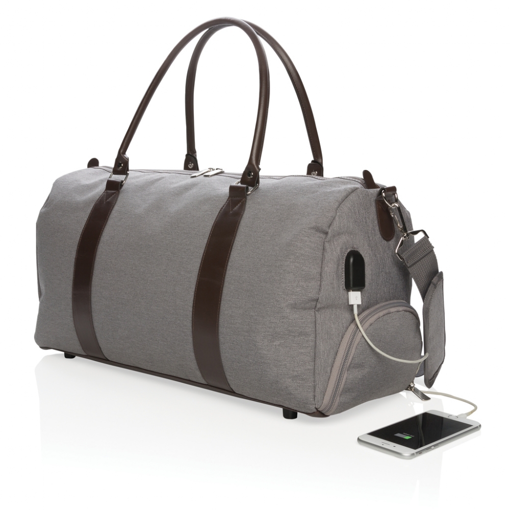 Artikel-Nr: XND707052Moderne und minimalistische Wochenendtasche aus 600D Polyester mit PU Tragegriffen und bequemem Schultergurt. Großes Hauptfach mit viel Stauraum für Ihre Wochenendausrüstung oder Sportkleidung. Verbinden Sie Ihre Powerbank ganz einfach mit dem integrierten USB A Port und laden Sie Ihr Telefon oder Tablet - "on the go"! Zudem verfügt die Tasche über eine praktische Eingriffstasche an der Seite. PVC-frei.