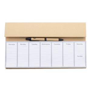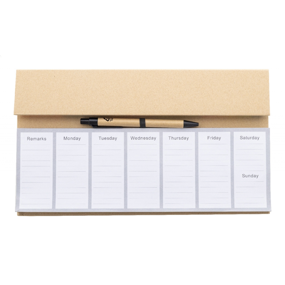 Artikel-Nr: AND800166-00Tischkalender-Set aus Recyclingpapier mit 50 undatierten Wochenplaner-Blättern, 100 Haftnotizen (in 4 Farben) und 125 Seitenmarkierungen (in 5 Farben). Inklusive Kugelschreiber aus Recyclingpapier mit blau schreibender Mine.