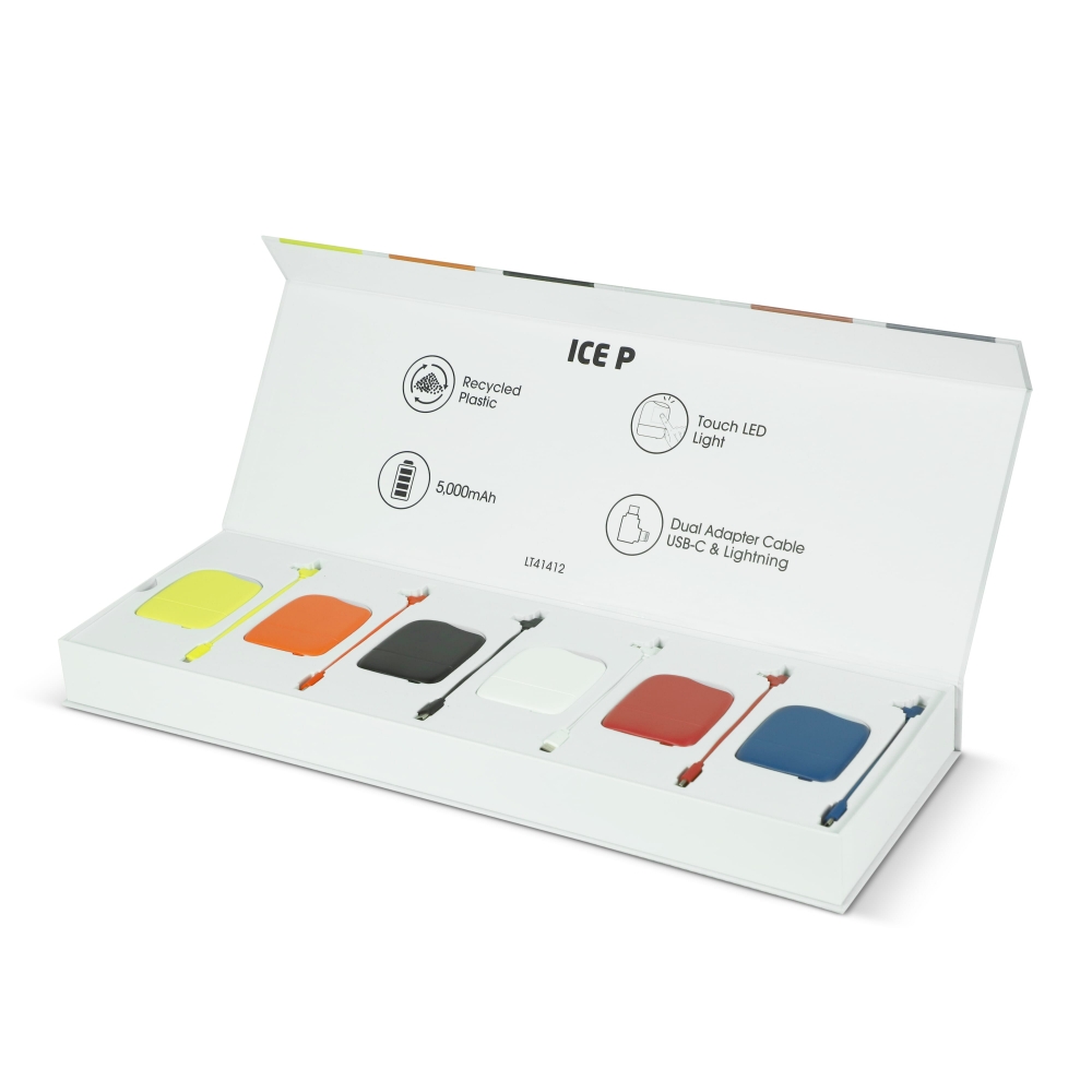 Artikel-Nr: ART06650N0995Präsentieren und betonen Sie die 6 leuchtenden Farben der Xoopar ICE P Powerbank 5000mAh. Diese Präsentationsbox zeigt das kompakte, schlanke und verspielte Design jeder Farboption für eine stilvolle und praktische Ladelösung.