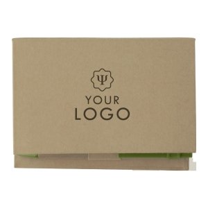Artikel-Nr: GIV6498029Notizzettelhalter aus Karton, mit 6 x 25 Haftnotizen, 150 Notizblättern, Einsteckfach auf der Deckel-Innenseite, Linealaufdruck und Kugelschreiber aus Karton mit Applikationen aus Kunststoff und blauer Mine.