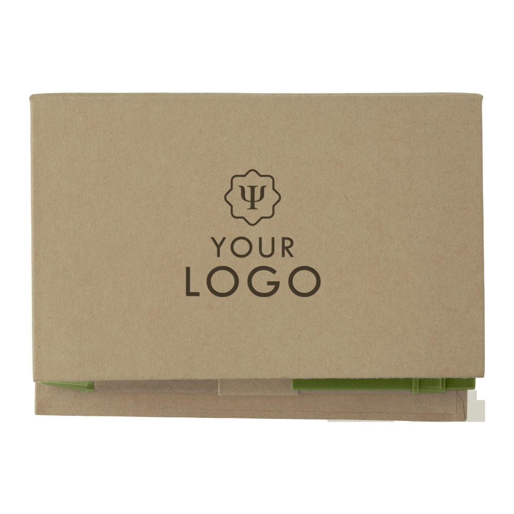 Artikel-Nr: GIV6498029Notizzettelhalter aus Karton, mit 6 x 25 Haftnotizen, 150 Notizblättern, Einsteckfach auf der Deckel-Innenseite, Linealaufdruck und Kugelschreiber aus Karton mit Applikationen aus Kunststoff und blauer Mine.