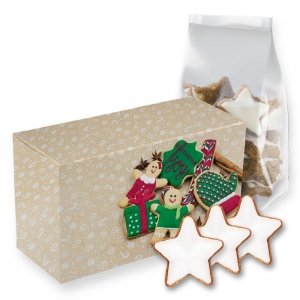 Artikel-Nr: FNM01895Faltschachtel. Werbeanbringung als Direktdruck in 4c individuell bedruckbar. Zutaten Zimtsterne: Zucker, Mandel-Haselnuss-Mischung (Mandeln, Haselnüsse), Weizenmehl, brauner Zuckersirup, Palmfett, Feuchthaltemittel: Sorbit, Invertase; Invertzuckersirup, Kartoffelstärke, Glukose-Fruktose-Sirup, Hühnereitrockeneiweiß, Süßmolkenpulver, Karamellzuckersirup, Rapsöl, Zimt, Orangenschalen, Apfelmark, Roggenmehl, Weizenstärke, Gewürze, Glukosesirup, Gelatine, Aprikosenkerne, Emulgatoren: Lecithine, Mono- und Diglyceride von Speisefettsäuren; Geliermittel: Pektin; Säuerungsmittel: Citronensäure; Backtriebmittel: Ammoniumcarbonate, Kaliumcarbonate, Natriumcarbonate, Diphosphate; natürliches Aroma, Salz. Kann andere Schalenfrüchte, Erdnüsse und Soja enthalten.