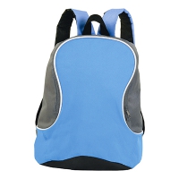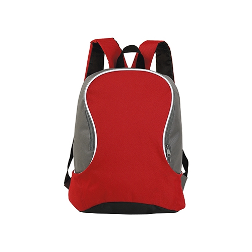 Zweifarbiger Rucksack mit einem Reißverschluss-Hauptfach, Schultertragegurten und Tragegriff.
